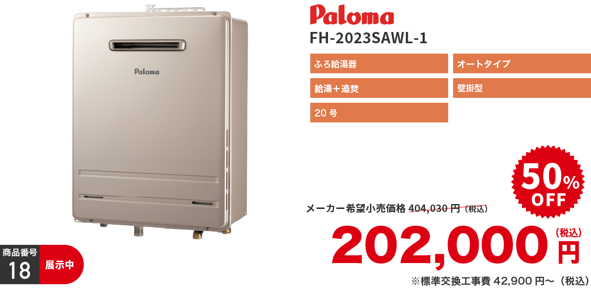 取付工事費 | ※リモコン等部材及び設置工事費別途 ※[標準交換工事内容]機器交換、廃棄処分、配管接続 ※現場状況により必要部材が発生する場合がございます |