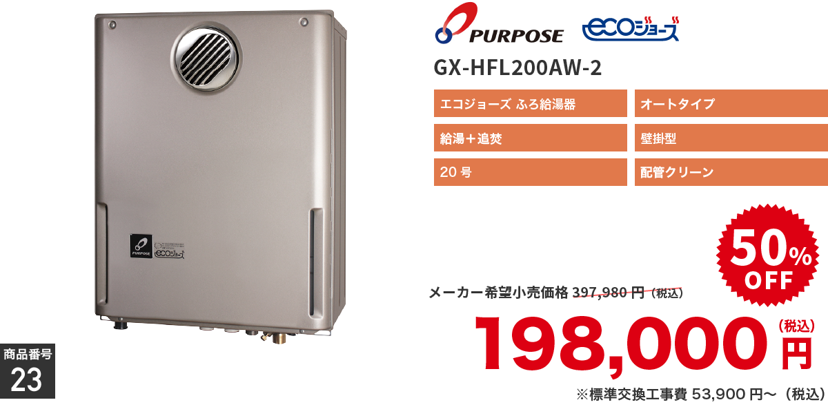 【商品番号23】パーパス エコジョーズふろ給湯器 GX-HFL200AW-2