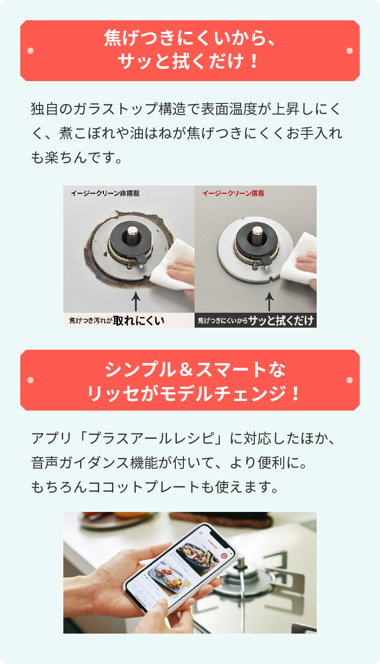 - トッププレートの裏側にアルミパネルを装着。バーナーまわりの熱を分散・放熱させて表面温度の上昇を抑えます。汚れが焦げつきにくく、簡単なお手入れでキレイを保ちます。