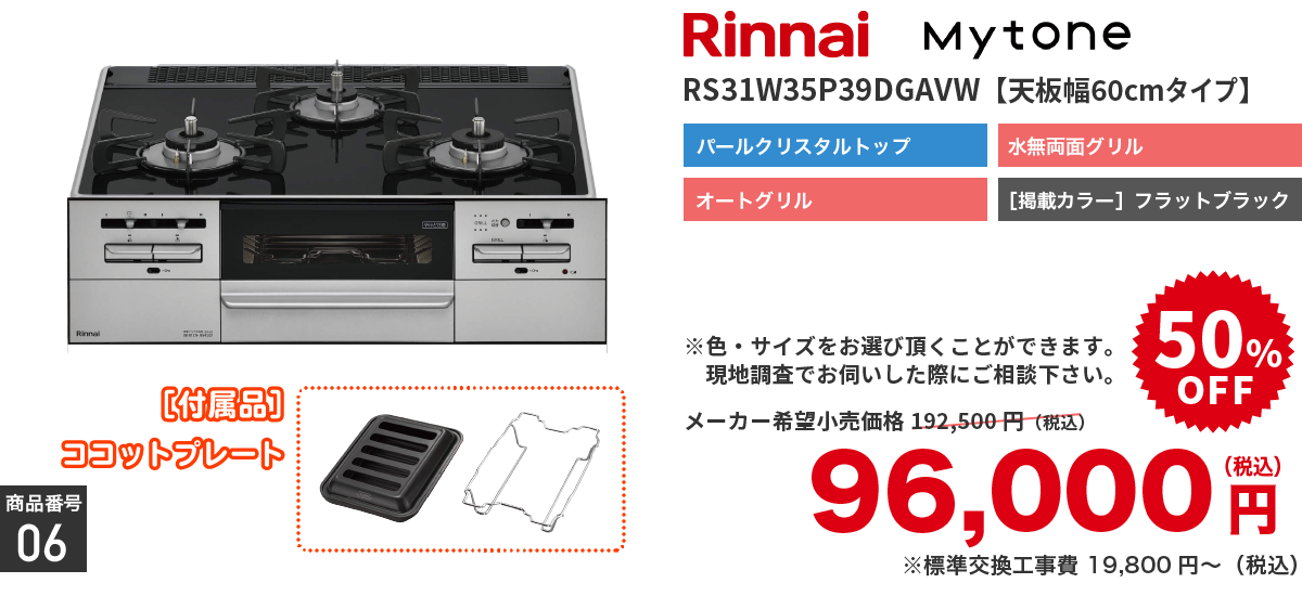 | 取付工事費 | ※部材及び設置工事費別途 ※[標準交換工事内容]機器交換、廃棄処分、配管接続 ※現場状況により必要部材が発生する場合がございます |