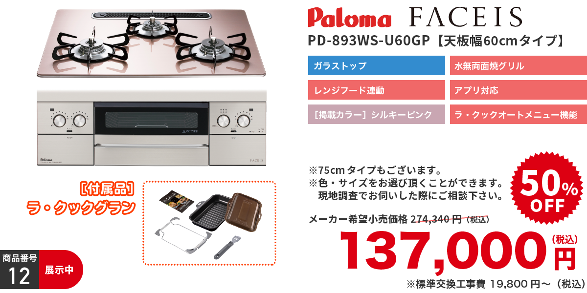 | 取付工事費 | ※部材及び設置工事費別途 ※[標準交換工事内容]機器交換、廃棄処分、配管接続 ※現場状況により必要部材が発生する場合がございます |