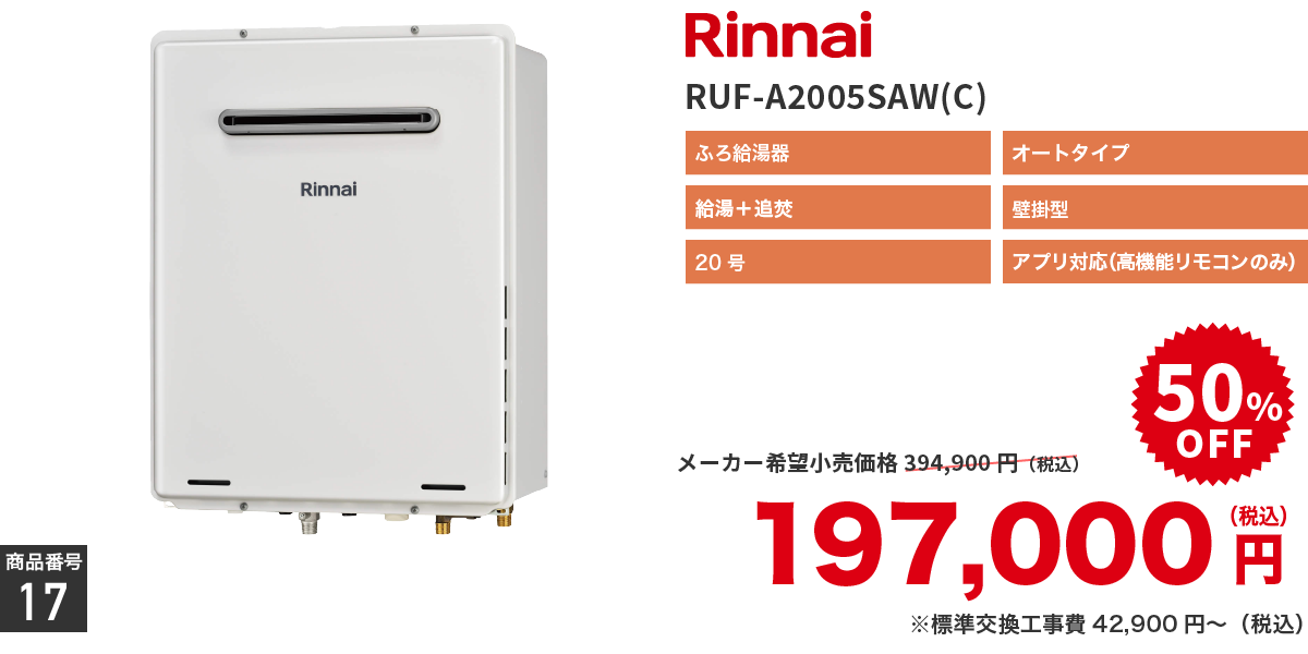 | 取付工事費 | ※リモコン等部材及び設置工事費別途 ※[標準交換工事内容]機器交換、廃棄処分、配管接続 ※現場状況により必要部材が発生する場合がございます |